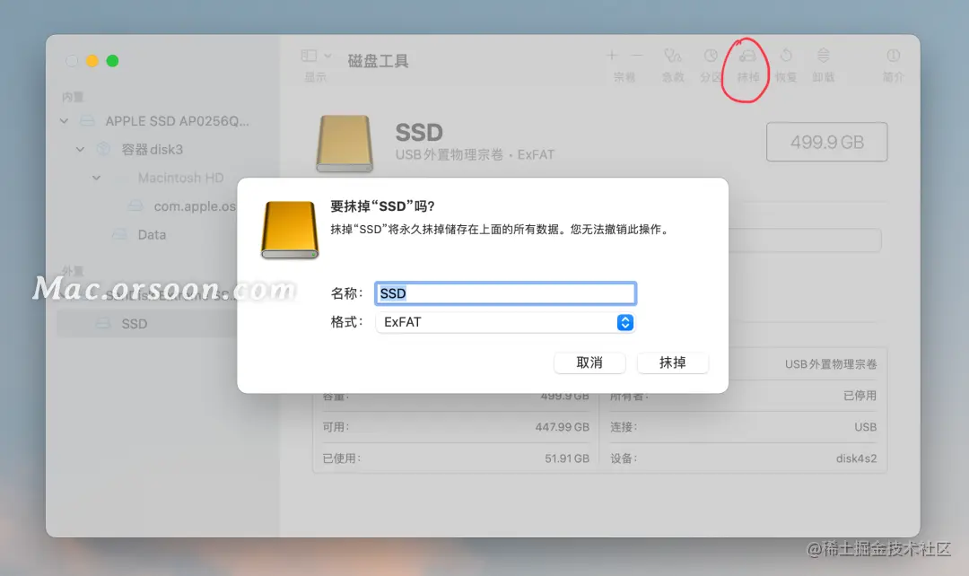 选择外置磁盘名称后,点顶部菜单栏的「抹掉」按钮,会显示抹掉对话窗口。这个「抹掉」跟 windows 上我们常说的「格式化」差不多一个意思。可以设置抹掉后磁盘的名字。然后选择抹掉后的格式。比如 APFS、Mac OS 扩展、或者兼容性更好的 FAT32、ExFAT。