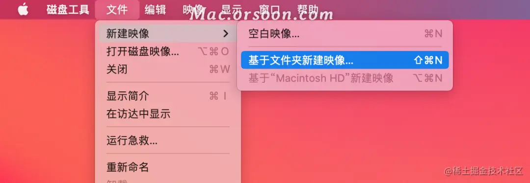 如果我们想把某个文件夹里的所有文件都保存成一个 dmg 映像文件,可以在「磁盘工具」的菜单栏中选择「基于文件夹新建映像」。