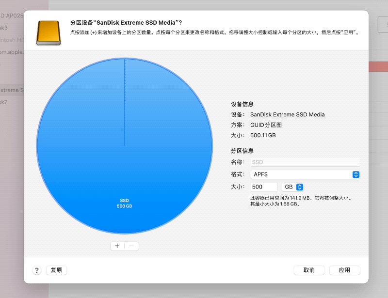 可以设置每个分区的空间大小,并且每个分区的文件系统格式也可以是不同的。比如一个分区是 APFS,另一个是 NTFS。