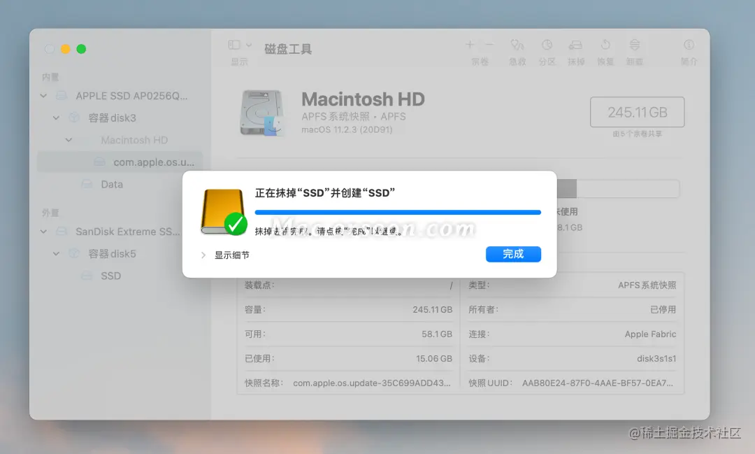 选择想要的文件系统格式后,点击「抹掉」。等待抹掉完成后,现在外置磁盘格式就变成新的了。