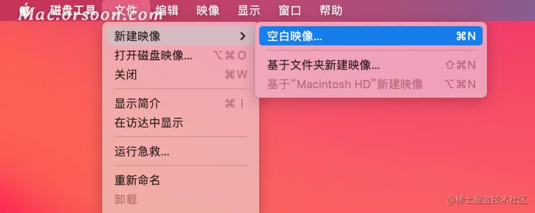 在「磁盘工具」的顶部菜单栏选择「文件」-「新建映像」-「新建空白映像」。