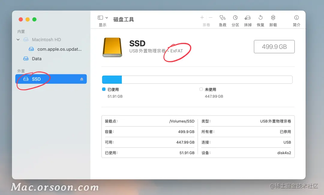 把外置磁盘设备连接到 Mac 上,打开「磁盘工具」,在左侧边栏的「外置」分类就能看到连接的磁盘。还能看到此磁盘的当前文件系统格式。常见的格式有 NTFS、FAT32、ExFAT,还有苹果的 Mac OS 扩展(又叫做 HFS+)、APFS。