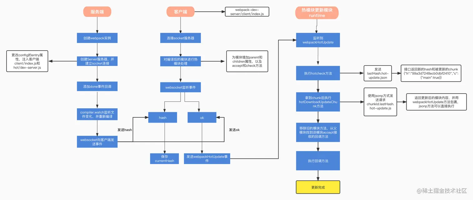 webpack实现热更新效果的时候主要有上图几个方面协同作用