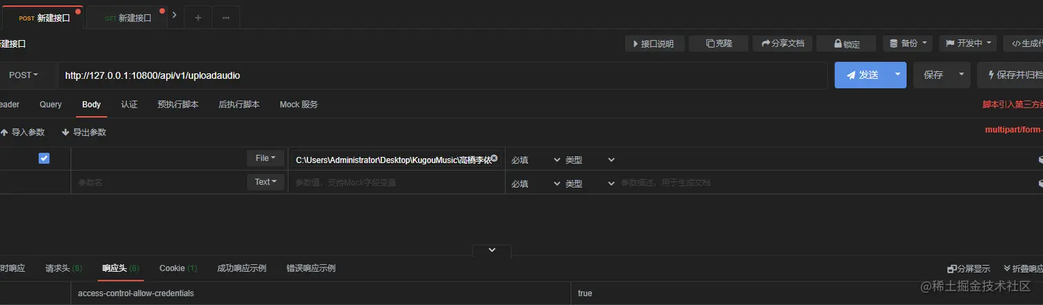 2)通过post请求来上传音频MP3文件即可: