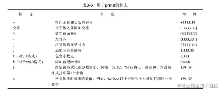 另外,还可以给出控制格式化输出的各种标志。表3-6列出了所有的标志。例如,逗号标志增加了分组的分隔符。即