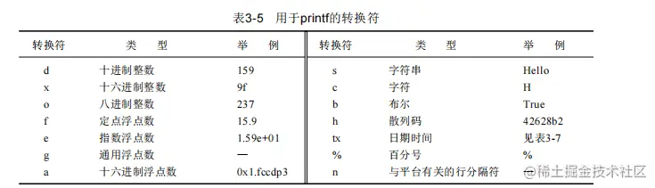 每一个以%字符开始的格式说明符都用相应的参数替换。格式说明符尾部的转换符将指示被格式化的数值类型:f表示浮点数,s表示字符串,d表示十进制整数。表3-5列出了所有转换符。