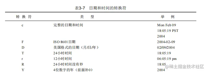尽管在第4章之前,没有对Date类型进行过详细地描述,但基于完整性的考虑,还是简略地介绍一下printf方法中日期与时间的格式化选项。在这里,使用以t开始,以表3-7中任意字母结束的两个字母格式。例如,