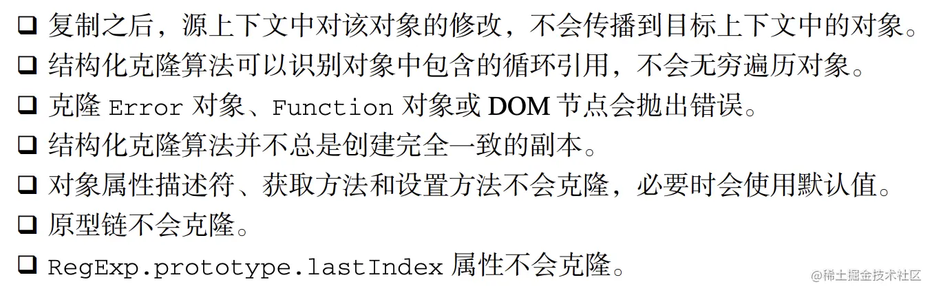 结构化克隆算法在对象比较复杂时会存在计算性消耗。因此,实践中要尽可能避免过大、过多的复制。