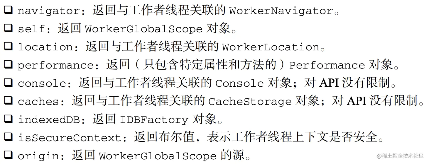 DedicatedWorkerGlobalScope 在 WorkerGlobalScope 基础上增加了以下属性和方法