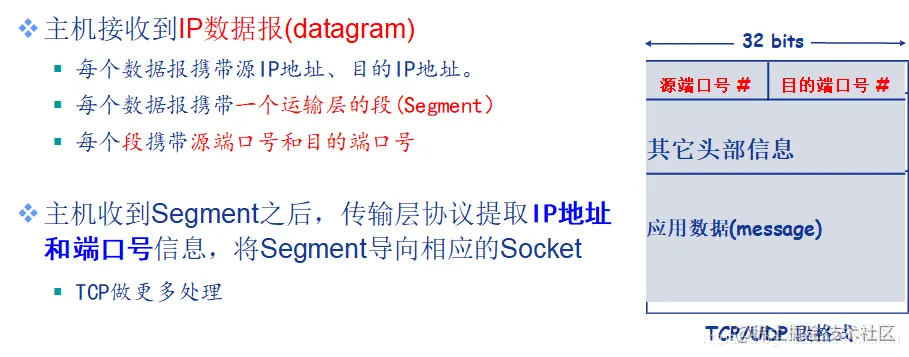 多路分用: 将运输层报文段中的数据交付到正确的套接字的工作