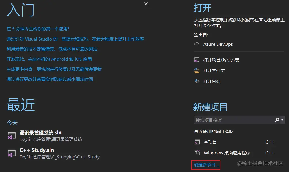 打开vs2017后,点击创建新项目,创建新的C++项目