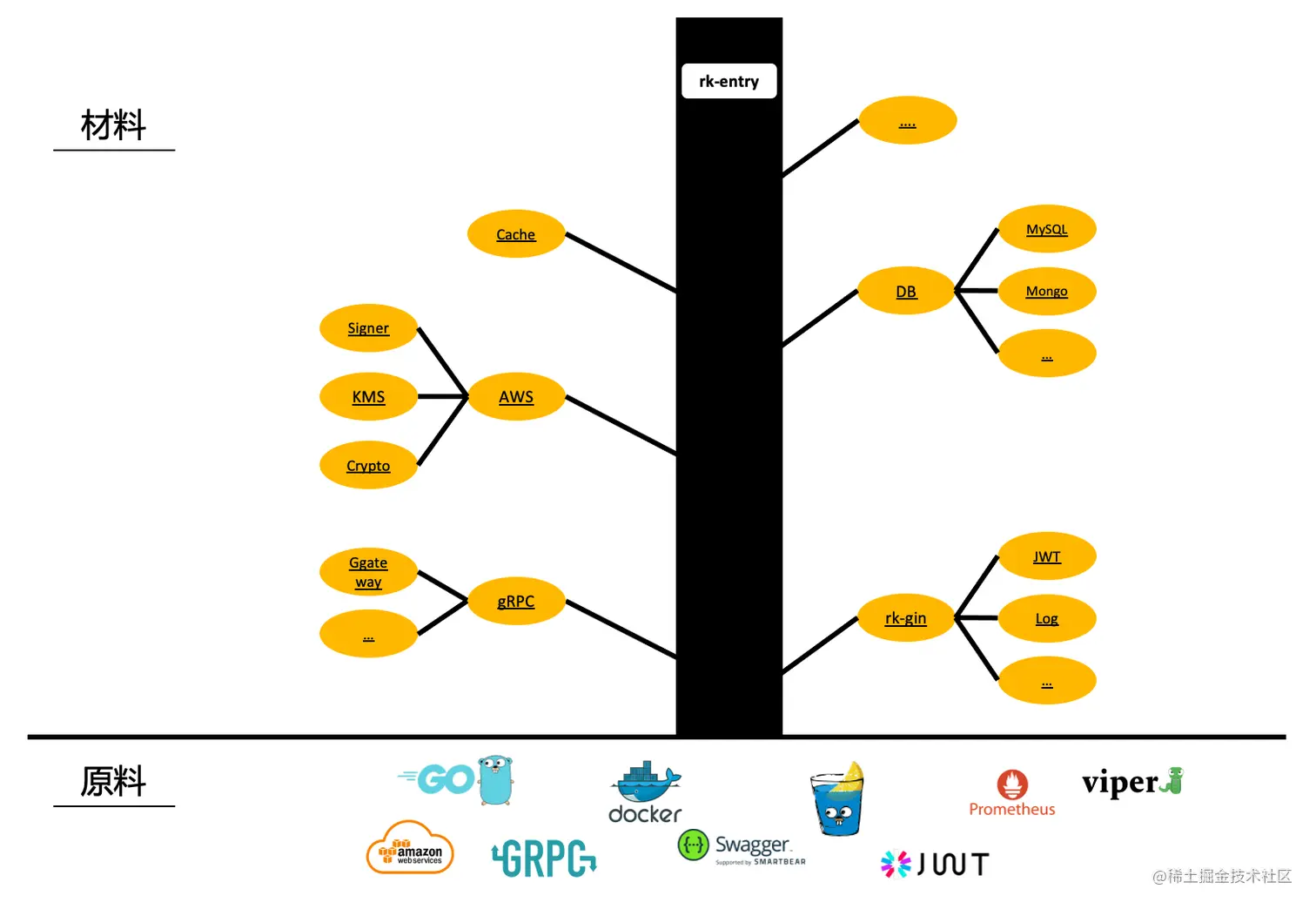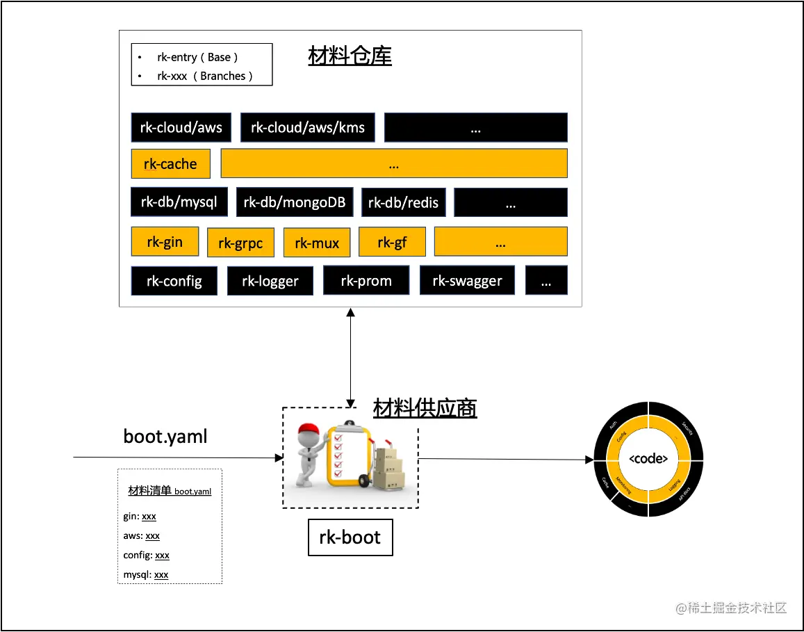 如果把实现 Golang 后端微服务比喻成制作一个产品,RK 在其中的作用相当于【材料提供商】,与使用【原生开源材料】不同点在于, 使用者不必考虑和学习如何初始化【原生开源材料】,如何配置,如何进行监控,错误处理。使用者唯一要做的就是,熟悉【原生开源材料】的使用方法,嵌入到代码里使用。 我们希望通过这种方式,节省开发者的时间成本,以及保证代码库的标准性。