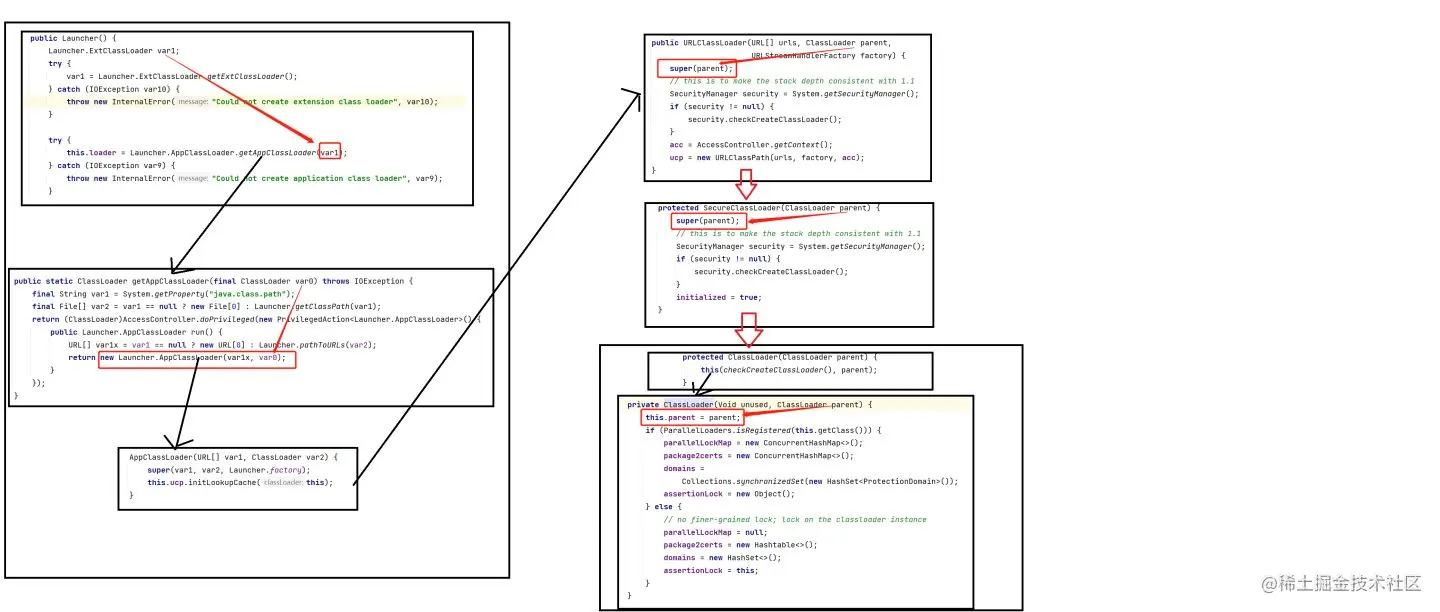 流程与扩展类加载器是一致的,最终都是调用ClassLoader的构造方法,需要注意的是AppClassLoader的getAppClassLoader方法是需要传入参数的。这个参数传的是扩展类加载器,根据调用过程,应用程序加载器的父加载器是扩展类加载器。