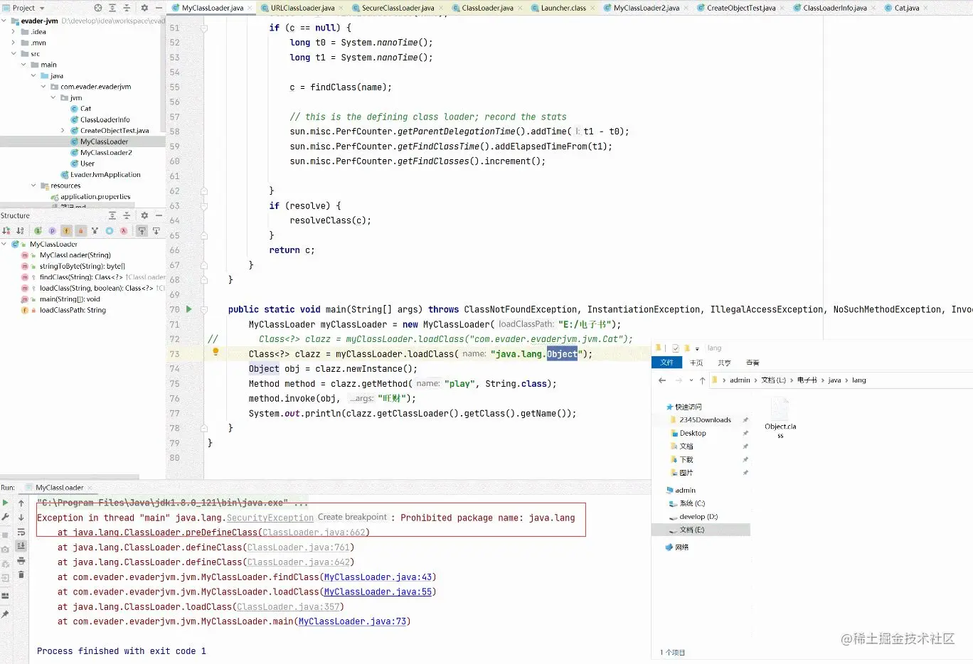 从gif图中可以看到我用自定义加载器加载java.lang.Object类(这个字节码文件拿的就是rt.jar包中的),发现加载不了。像这种核心API是不可以随便加载的,如果可以随便加载就会被侵入,后果非常严重,现在对沙箱安全有进一步的理解了吧。