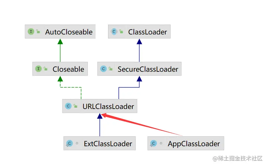 (AppClassLoader继承了URLClassLoader,idea不给画线我就自己来)几个类之间的关系是扩展类加载器,应用程序加载器 -> URLClassLoader -> SecureClassLoader-> ClassLoader。