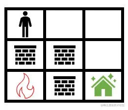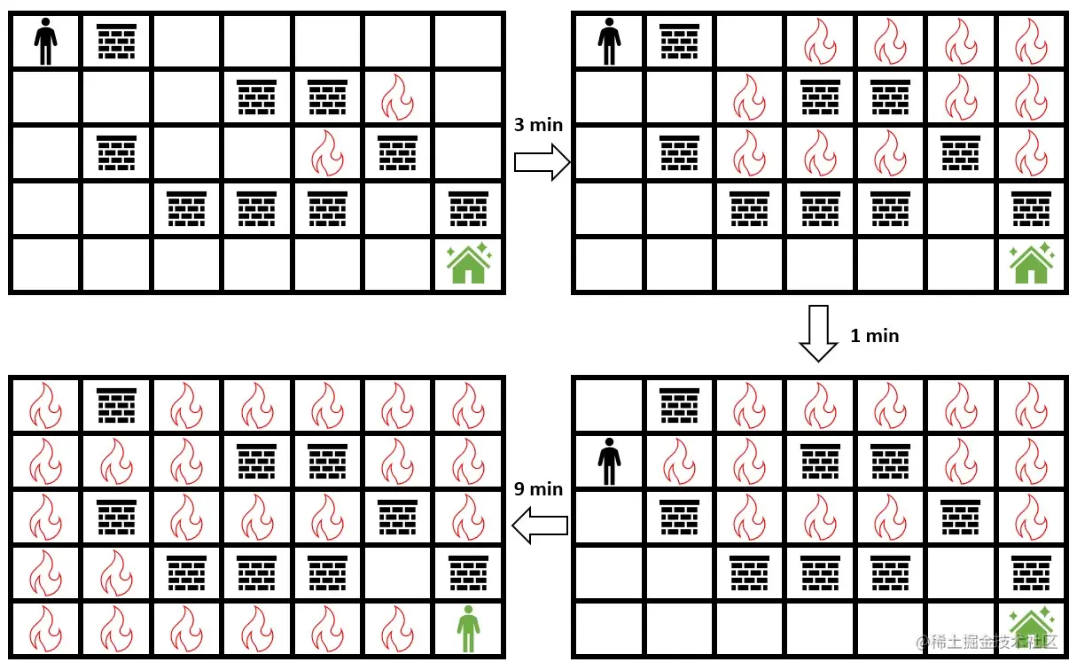 人一开始左上角的单元格 (0, 0) ,并且您想前往位于右下角的单元格 (m - 1, n - 1) 的安全屋。每分钟都可以移动到相邻的格子。人移动后的同时,每个火苗都会蔓延到所有相邻的非墙壁单元。
