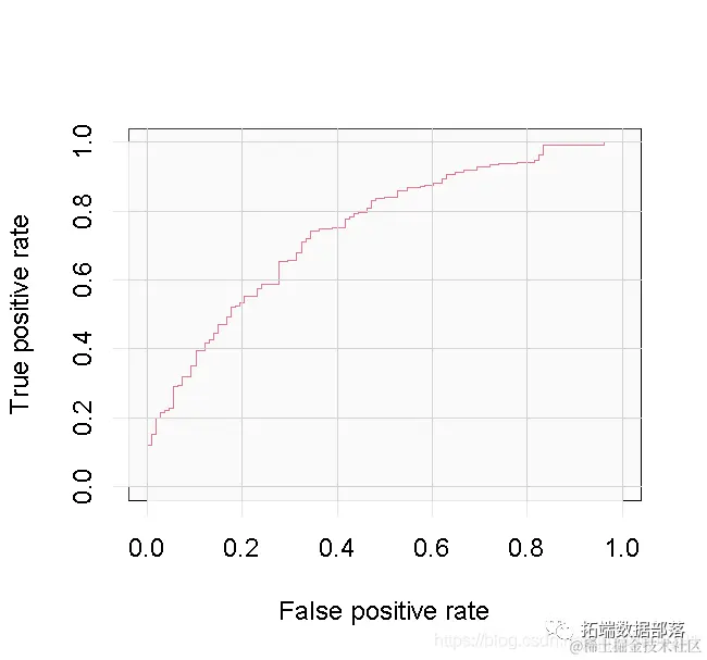 我们已经拟合了模型。现在我们将使用ROCR包来创建预测,并以曲线下面积(AUC)来衡量性能。AUC越大,说明我们的模型表现越好。