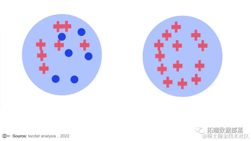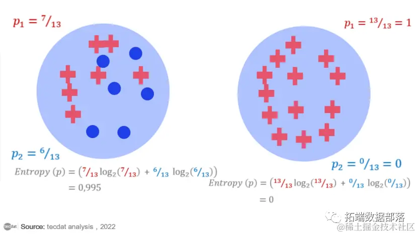 为了更好地理解熵,让我们研究两个不同的示例数据集,它们都有两个类,分别表示为蓝点和红叉。在左侧的示例数据集中,我们混合了蓝点和红叉。在右侧数据集的示例中,我们只有红十字。第二种情况——一个只有一个类样本的数据集——是我们的目标:一个“纯”数据子集。