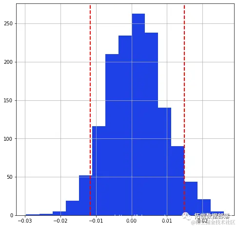 print(percentile( returns,5),percentile( returns,95)) VaR - 在5%的概率下,最小损失为5.7%,同样,在5%的概率下,收益可以高于15%