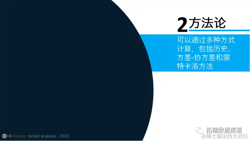 - 该度量可以通过多种方式计算,包括历史、方差-协方差和蒙特卡洛方法。