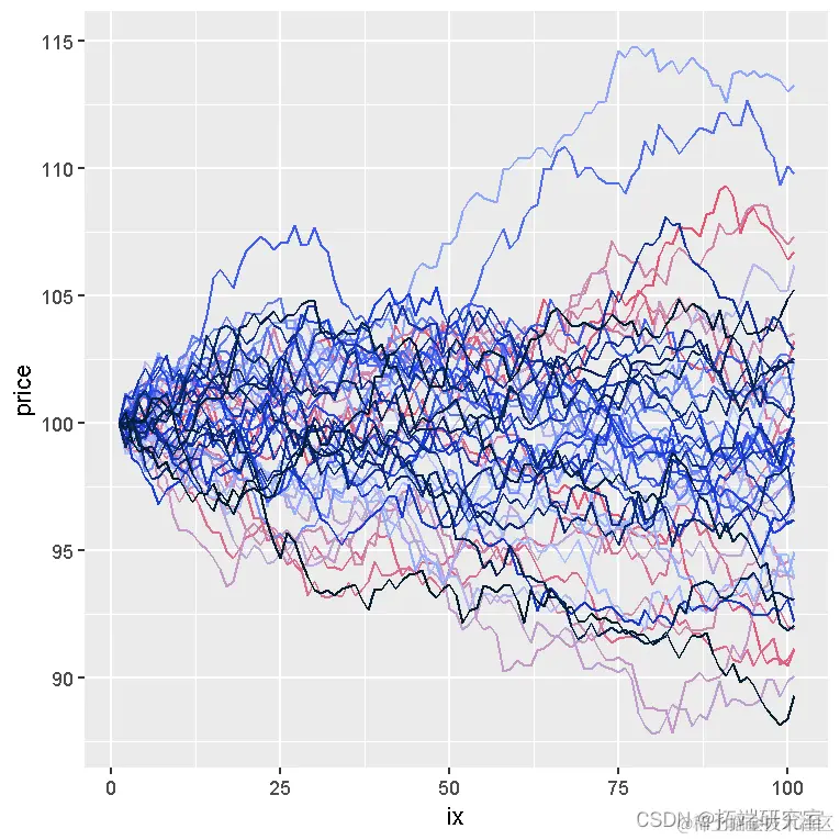 如果我运行 50 次,我会得到如下所示的价格路径: