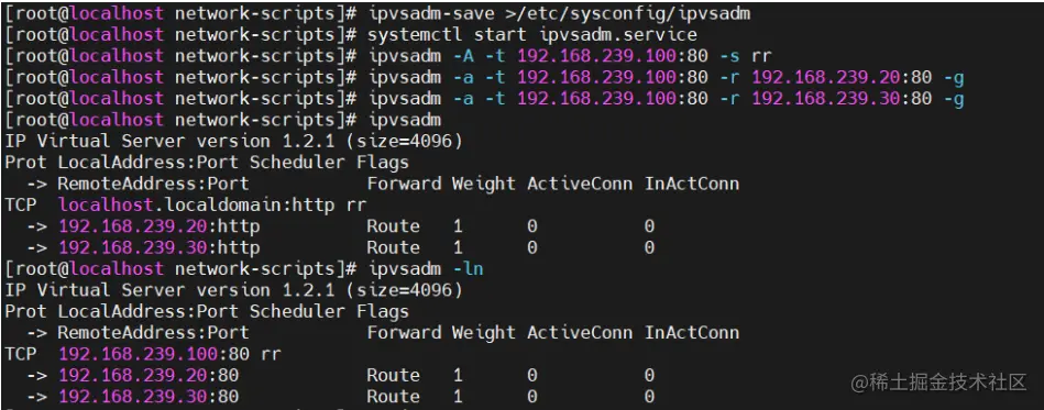 ipvsadm -A -t 192.168.239.100:80 -s rr #添加虚拟服务器指定vip地址指定调度策略为轮询