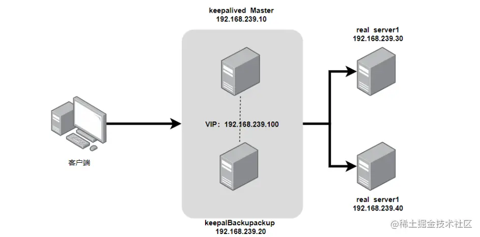 - 在一个LVS服务集群中通常有主服务器(MASTER)和备份服务器(BACKUP)两种角色的服务器,但是对外表现为一个虚拟IP。主服务器会发送VRRP通告信息给备份服务器,当备份服务器收不到VRRP消息的时候,即主服务器异常的时候,备份服务器就会接管虚拟IP,继续提供服务,从而保证了高可用性