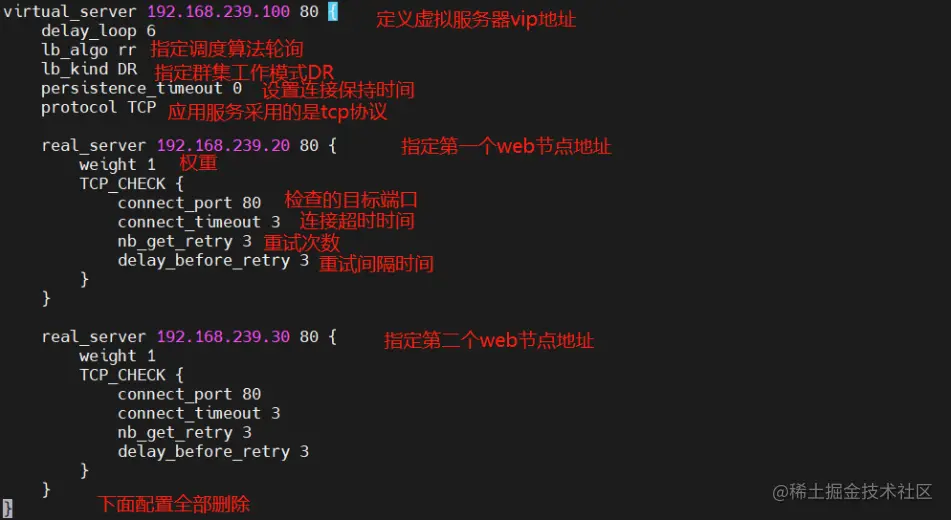 real_server 192.168.239.20 80 { #修改,指定第一个Web节点的地址、端口
