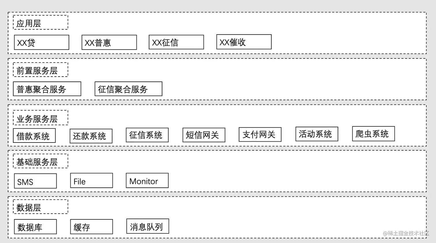 - 业务服务层:包含各种基础的业务服务单元,比如借款系统、还款系统、征信系统、活动系统、爬虫系统、引流系统、文件系统等。
