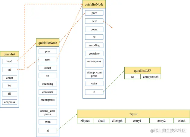 quicklistNode结构的zl成员指向quicklistLZF结构