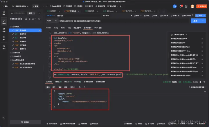 apt.Visualizing(template, {title:"可视化演示", json:response.json}) // 传入展示数据并可视化展示。其中 response.json的意思是返回的json,具体可以下文。