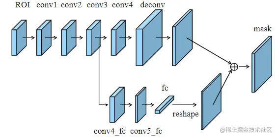 与FCN相比,FC层能产生不同的属性。FCN在局部像素的基础上对每个像素进行预测,并且在不同的空间位置共享参数。相反,FC层是位置敏感的,通过改变参数集可以实现不同空间位置的预测,因此它具有适应不同空间位置的能力。还使用整个推荐区域的全局信息在每个空间位置进行预测,对区分实例并识别属于同一目标的独立部分很有帮助。给定FC层和卷积层的属性互不相同,针对原有的分割支路(FCN)引入了一个前、背景二分类的全连接支路,通过融合这两条支路的输出得到更加精确的分割结果,可以获得更好的Mask预测。