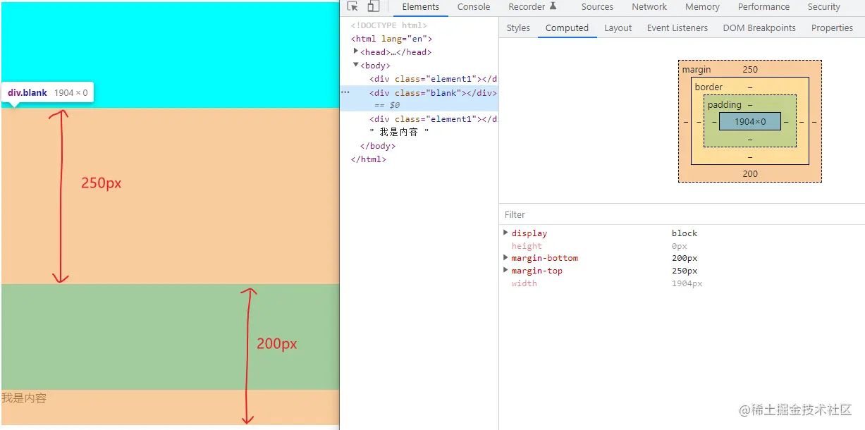 原本位于第二行的空元素设置了距离顶部元素200px,距离底部元素250px,如果不发生折叠,element1和第element2的距离应该是 200+ 0 + 250=450px,然而实际上确只有250px。也就是说这个空元素自身的margin 发生了折叠,只取了大的值250px,另外的200px被折叠且溢出到了空盒子的下面,但有意思的是,溢出的部分就跟失效了一样,并不会影响到element2和下方字体的布局