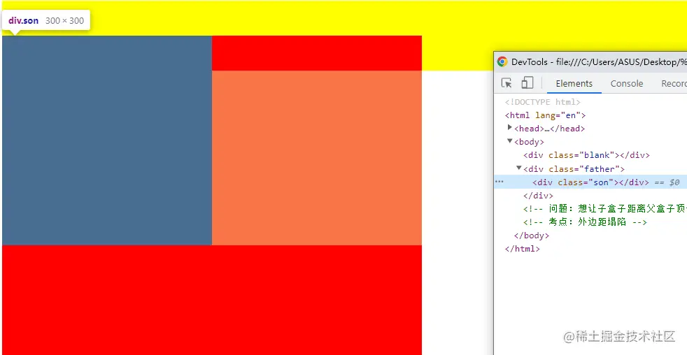 我们希望看到的效果是子元素距离父元素顶部50px,父元素再距离它的父元素顶部10px。但真正的渲染效果是:子元素和父元素的顶部在同一水平线上,并距离顶部50px,并不是我们想要的效果