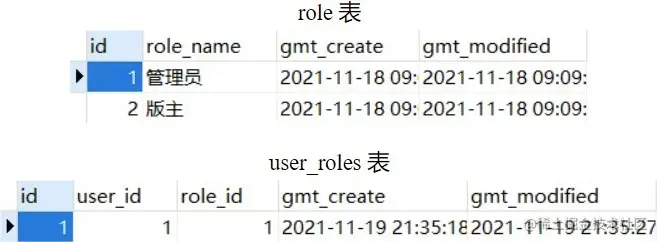 然后创建 role 表(存储角色信息)和 user_roles 表(存储用户和角色的关联信息):