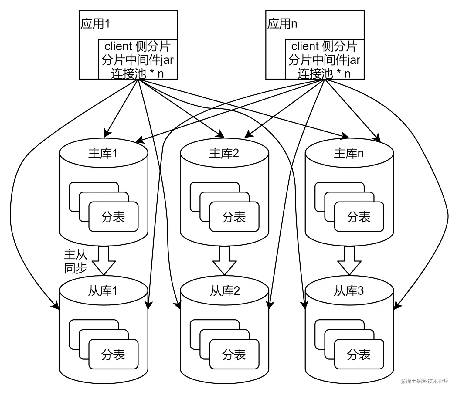 - client侧分片:较为常见,以jar包库的方式内嵌在服务中,需要与所有的数据库实例,各自建立和维护连接池,性能好