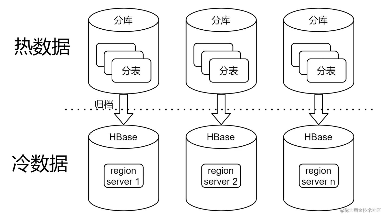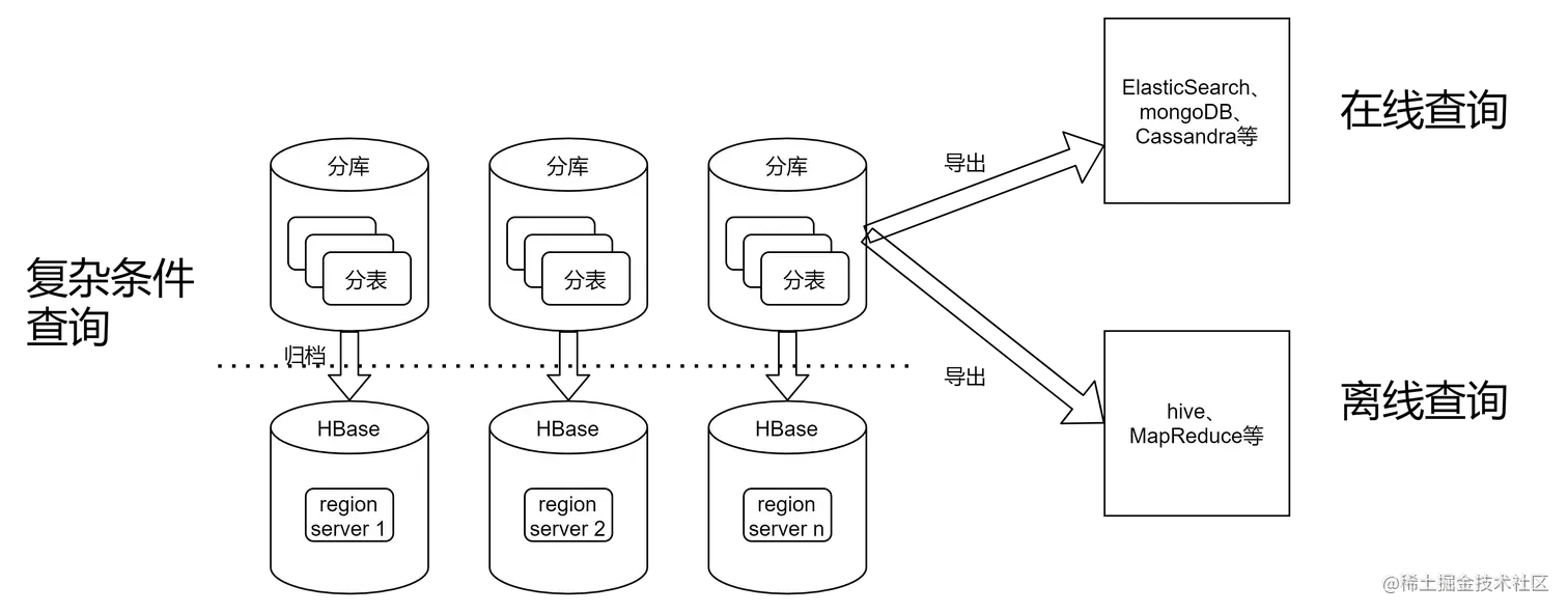 - 归档:定期把数据从mysql归档至hbase,mysql只保留最新的热数据,hbase存储全量数据