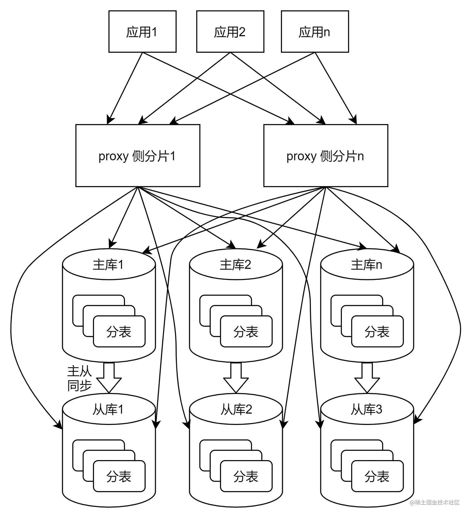 - proxy侧分片:proxy是一个数据库访问中间层服务,应用与proxy建立少量连接,proxy与所有的数据库实例建立连接,优点是对应用开发简单透明,缺点是有性能损耗、需要专门的团队维护