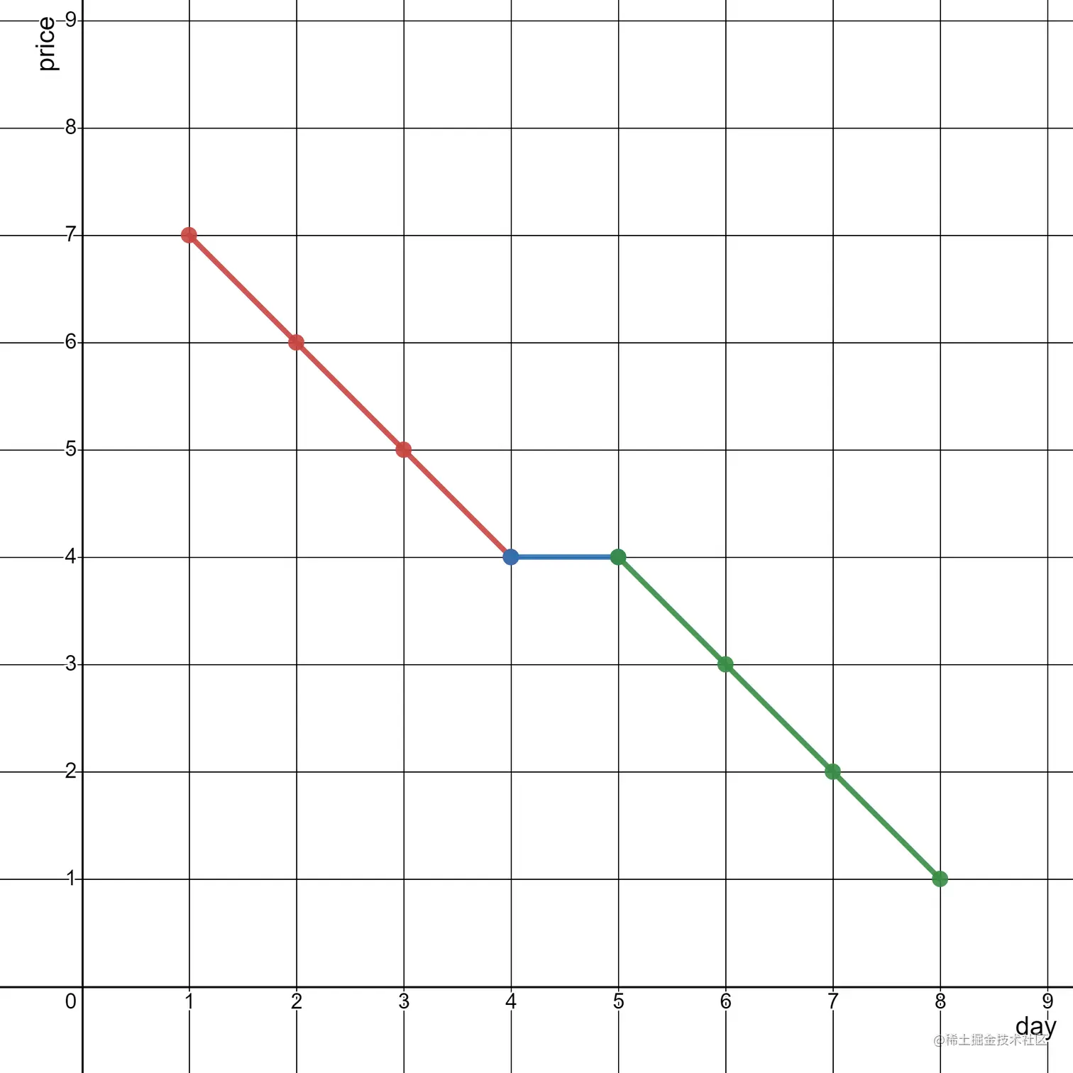 给你一个二维整数数组 stockPrices ,其中 stockPrices[i] = [dayi, pricei] 表示股票在 dayi 的价格为 pricei 。折线图 是一个二维平面上的若干个点组成的图,横坐标表示日期,纵坐标表示价格,折线图由相邻的点连接而成。比方说下图是一个例子:
