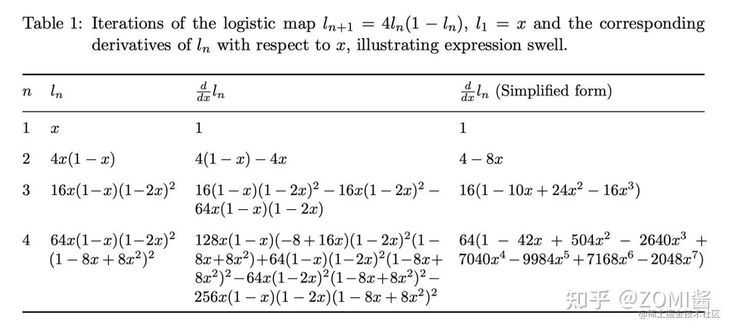 但符号微分的最大弊病在于其对表达式的严格展开和变换也导致了所谓的表达式膨胀(expression swell)问题。以递归表达式为例: