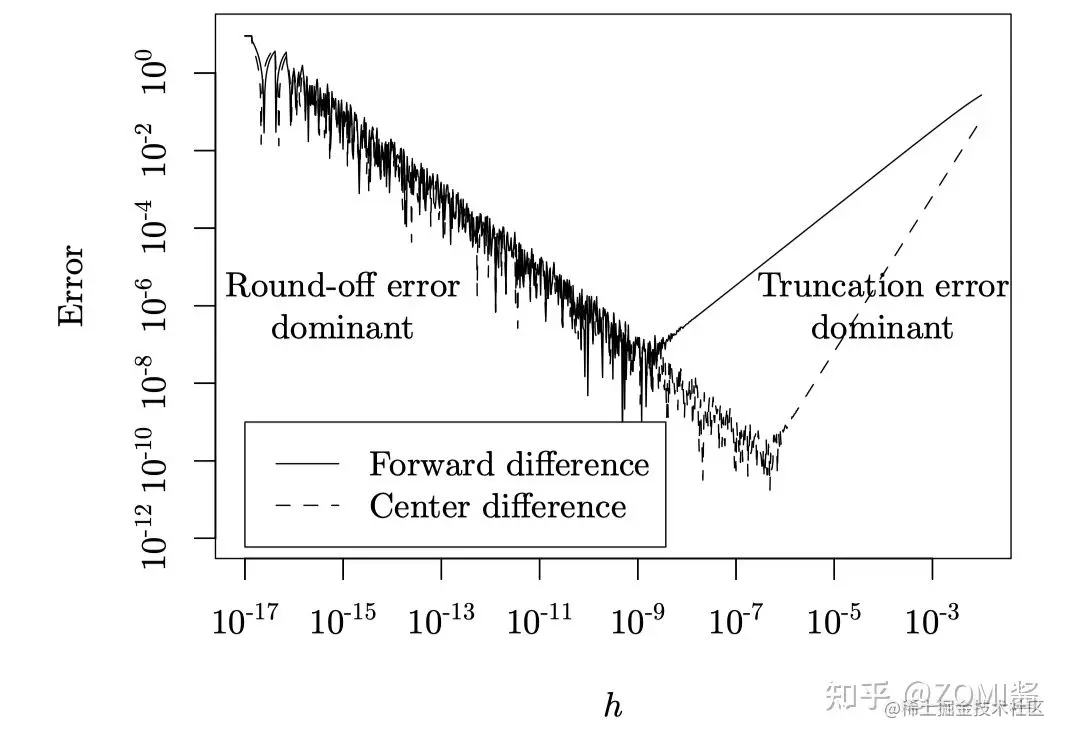 - 舍入误差(Round-off Error):在计算过程中出现的对小数位数的不断舍入会导致求导过程中的误差不断累积。