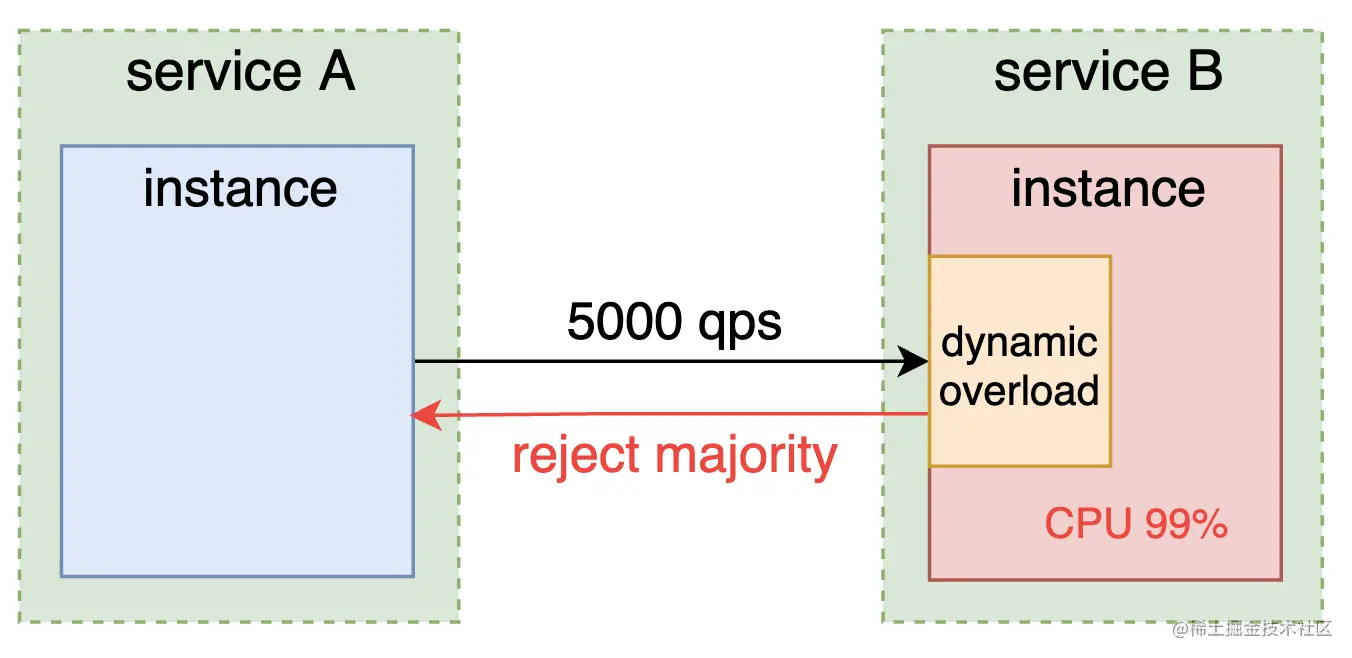 - 在负载高的实例中,主动拒绝一部分请求,防止实例被打挂