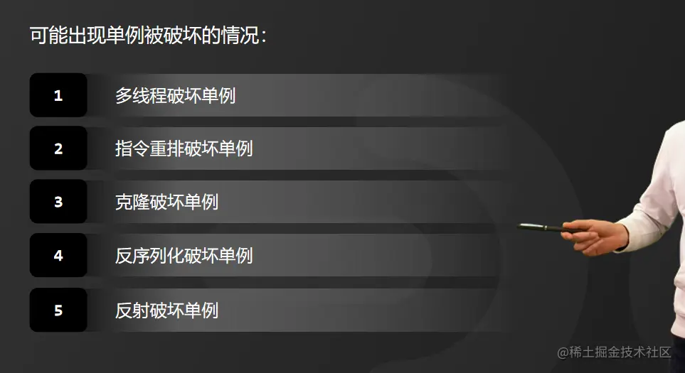 我把可能出现单例被破坏的情况,一共归纳为五种,分别为多线程破坏单例、指令重排破坏单例、克隆破坏单例、反序列化破坏单例、反射破坏单例。