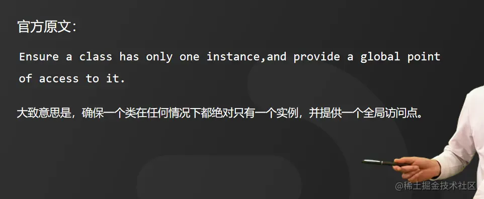 大致意思是,确保一个类在任何情况下都绝对只有一个实例,并提供一个全局访问点。