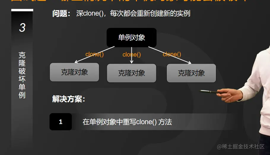 在Java中,所有的类就继承自Object,也就是说所有的类都实现了clone()方法。如果是深clone(),每次都会重新创建新的实例。那如果我们定义的是单例对象,岂不是也可调用clone()方法来反复创建新的实例呢?确实,这种情况是有可能发生的。为了避免发生这样结果,我们可以在单例对象中重写clone() 方法,将单例自身的引用作为返回值。这样,就能避免这种情况发生。