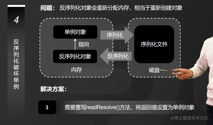 我们将Java对象序列化以后,对象通常会被持久化到磁盘或者数据库。如果我们要再次加载到内存,就需要将持久化的内容反序列化成Java对象。反序列化是基于字节码来操作的,我们要序列化以前的内容进行反序列化到内存,就需要重新分配内存,也就是说,要重新创建对象。那如果要反序列化的对象恰恰是单例对象,我们该怎么办呢?