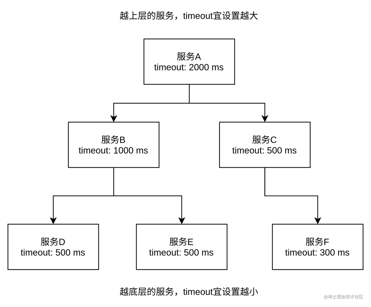 漏斗型:从上到下,timeout时间建议由大到小设置,也即底层/下游服务的timeout时间不宜设置太大;否则可能出现底层/下游服务线程池耗尽、然后拒绝请求的问题(抛出java.util.concurrent.RejectedExecutionException异常)