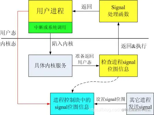 Linux下的信号采用的异步处理机制,信号处理函数和当前进程是两条不同的执行路线。具体的,当进程收到信号时,操作系统会中断进程当前的正常流程,转而进入信号处理函数执行操作,完成后再返回中断的地方继续执行。