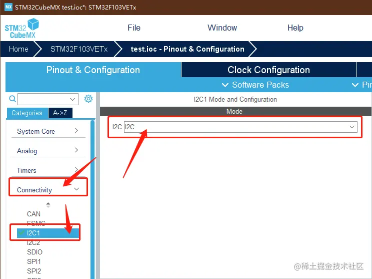 在 Connectivity 中选择 I2C1 设置,并选择 I2C 内部集成电路