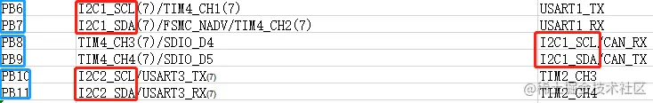 STM32 芯片有多个 I2C 外设,它们的 I2C 通讯信号引出到不同的 GPIO 引脚上,使用时必须配置到这些指定的引脚。PB8 PB9 为重映射。